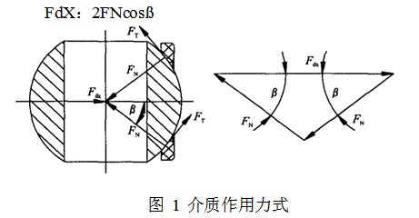 由于閥座和殼體不是粘接密封而是壓縮密封,因此出口端閥座軸向總密封力FMZ應由閥座軸向動密封力FdX和靜密封力FJX合成。文獻[ 1 ]推薦FMZ :FNC0,其值得推敲,F(xiàn)N是FMZ分力,應小于FMZ,其次未納人靜密封力,不適合壓縮密封的靜密封結構。由此計算的啟閉力矩也與測量值不符。忽略空心球重力影響,F(xiàn)dX在動密封面上分解為法向力FN和摩擦力FT。其中FT為較小量,省略不計,則FdX分解為一對法向力(圖1),顯然
