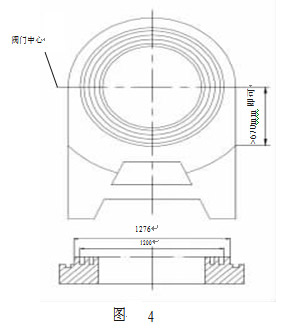 為電動閘閥導軌和閥板的配合示意圖,導軌均為楔形結構,導軌與座圈組裝后,形成一帶角度的空隙,閥板導軌在此空隙間移動。要求閥關閉后其閥板與閥座圈密封面的間隙平均小于 0.051mm。此閥為常開閥,正常情況下,每年關閉不超過 1 次,關閉時,一方面靠流通介質的力量使閥板與座圈貼緊,另一方面,通過閥板楔入,使閥板與座圈的密封面貼緊,從而達到密封的目的。 該閥門的開關行程為 1300mm,理論上座圈導軌的工作長度是 1300mm(從閥門中心起),實際上座圈導軌除閥門通道口受流通介質沖蝕外,其余部分只起導向作用,所以我們可以在滿足工況要求的前提下將座圈導軌的堆焊部位縮短,使其長度大于環(huán)形密封面口徑的一半 670mm (從閥門中心起)即可。 考慮以上原因,我們調整加工工藝為:粗車平面及環(huán)形堆焊槽,粗車導軌堆焊部位(粗車圖如圖 4),劃導軌堆焊位置線,堆焊,熱,校平,精車環(huán)形密封面,精刨導軌,在粗加工階段為盡量增大工件的剛性,同時減少工序周轉,座圈尾部先不加工,精加工完環(huán)形密封圈及導軌后,在導軌與環(huán)形密封面夾縫處仍有大量毛坯高出密封面及導軌,須將其去除,我 們采用銑加工。