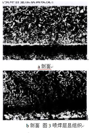 由圖3a可知,結合層由兩部分組成,即上方的噴焊合金層和下方的母材熱影響區層。合金層組織主要呈枝晶生長狀態,且枝晶細小;從圖3b可看出